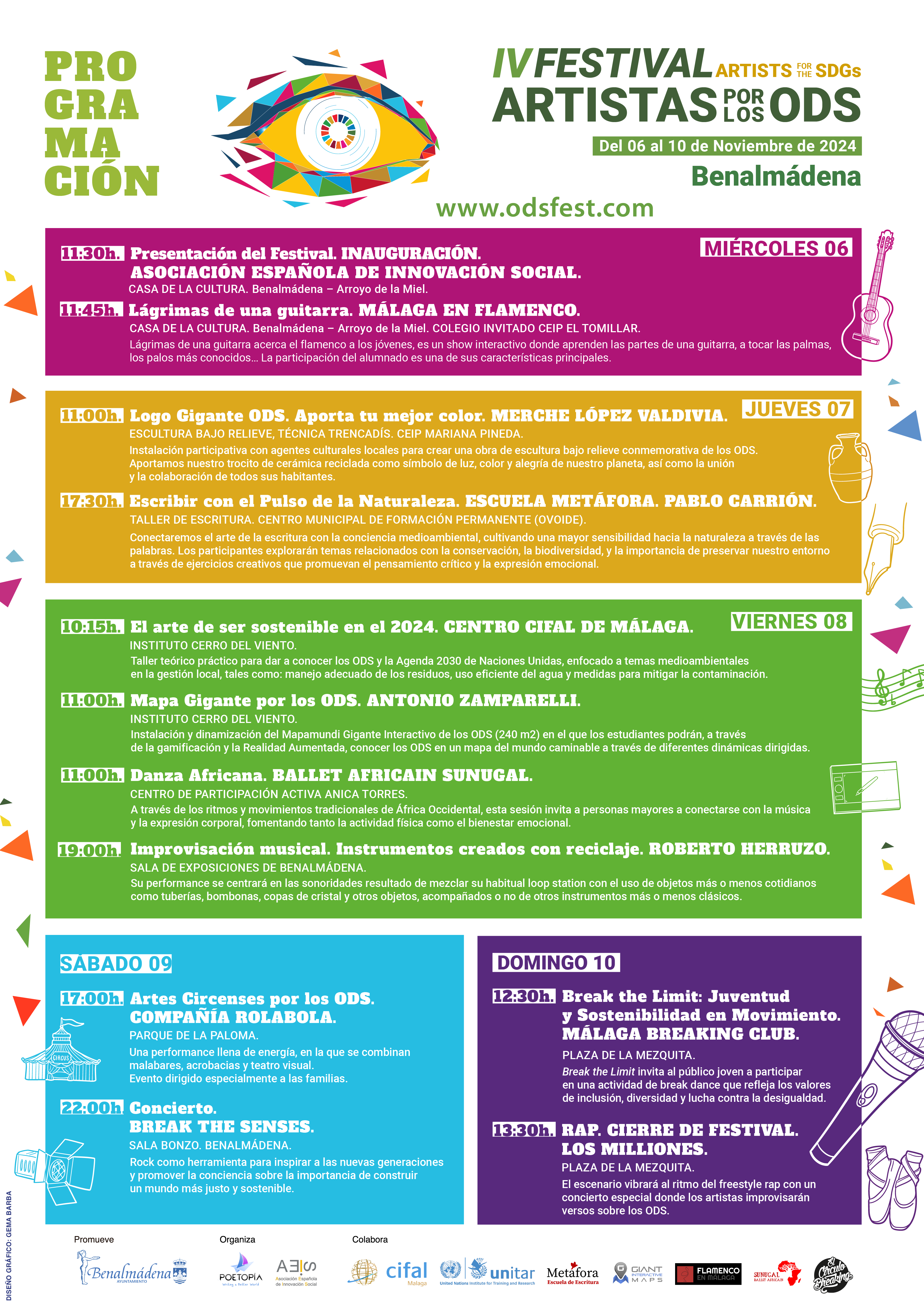 Cuenta atrás para el 1º Festival de Artistas comprometidos con los ODSen Benalmádena, Málaga. 7 días llenos de arte a través de numerosas disciplinas y varias ubicaciones. Conciertos, concursos, actividades familiares, ¡y mucho más!